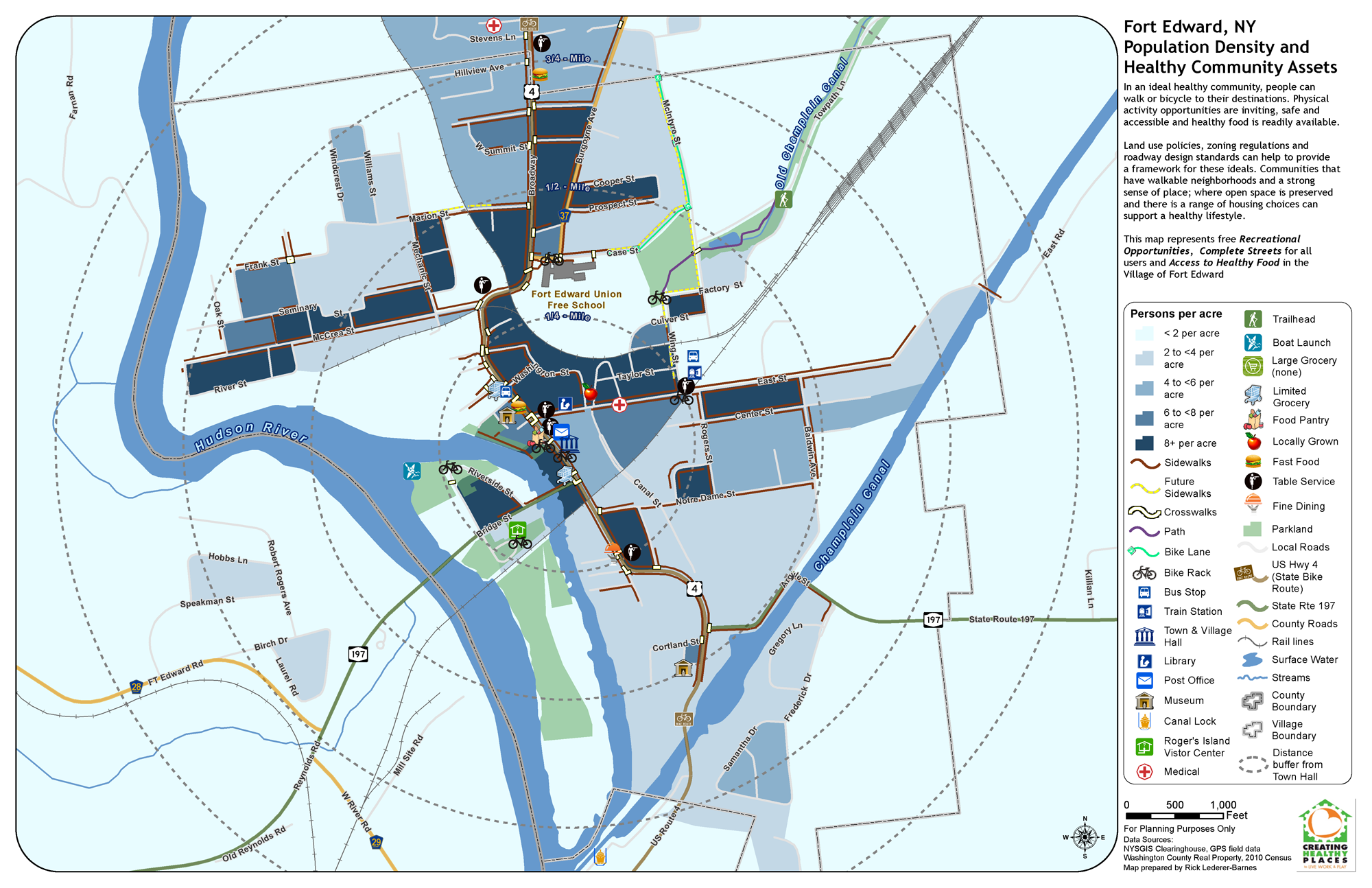In 2013 Rick created a series of maps for the The Health Promotion Center at Glens Falls Hospital in support of the Creating Healthy Places to Live, Work and Play program. Recreational Opportunities, Complete Street Assets, and Access to Health Food were mapped in the Town of Warrensburg, NY and the Village of Fort Edward, NY. Several new datasets for Healthy Community Assets were created as part of this project. By looking at the assets in relation to population density, an evaluation was made as to what areas may be underserved. The project was renewed in 2014 to study the Town of Chester and Village of Hudson Falls, NY.